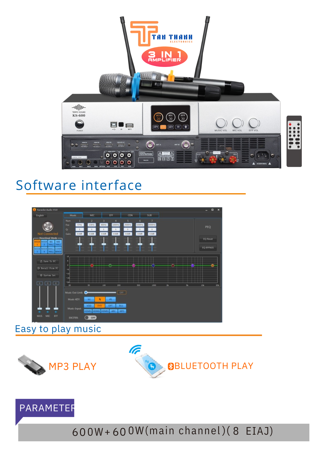 Với Tempo Sound KS600 - Ampli 3 trong 1, bạn không chỉ có một thiết bị âm thanh đa năng, mà còn được trải nghiệm âm thanh chuyên nghiệp và tiện lợi. Hãy trang bị cho hệ thống giải trí của bạn và tận hưởng những khoảnh khắc âm nhạc đáng nhớ cùng Tempo Sound KS600 ngay hôm nay!