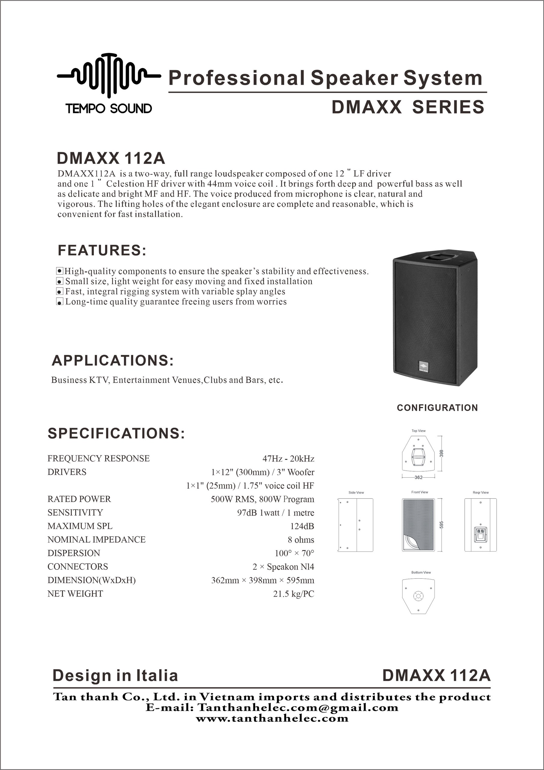 và một trình điều khiển Celestion HF 1" với cuộn dây âm thanh 44mm. Đồng thời mang đến âm thanh mạnh mẽ, sâu lắng và tự nhiên. Với khả năng tái tạo bass tốt cùng các chi tiết tinh tế, loa DMAXX 112A là sự lựa chọn hoàn hảo cho các ứng dụng như kinh doanh Karaoke KTV, sân khấu, câu lạc bộ và quán bar phòng trà