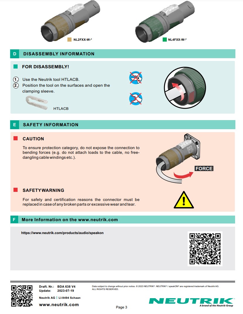 Đầu nối speakON là tiêu chuẩn công nghiệp cho kết nối loa. Dòng sản phẩm này cung cấp đầu nối cáp cực kỳ đáng tin cậy và chắc chắn với hệ thống khóa xoắn đã được chứng minh. Đầu nối cáp speakON có các tiếp điểm chắc chắn với các đầu nối loại vít bao gồm bảo vệ dây xoắn
