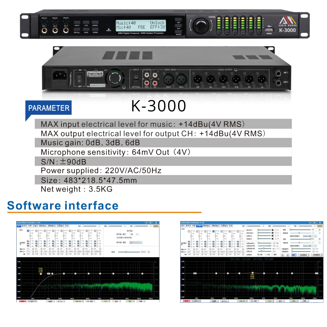 Sản phẩm cũng đi kèm với các tính năng như chức năng tắt tiếng micro, thiết kế nén/giới hạn độc lập, chế độ làm mờ phản hồi tần số tùy chọn và khả năng điều chỉnh cao/thấp trên kênh hiệu ứng và kênh đầu ra. Hơn nữa, Audio Manor K3000 hỗ trợ các giao diện điều khiển VOD IR và kết nối RS232 với máy tính, cung cấp sự linh hoạt và tiện ích trong việc điều khiển và quản lý.