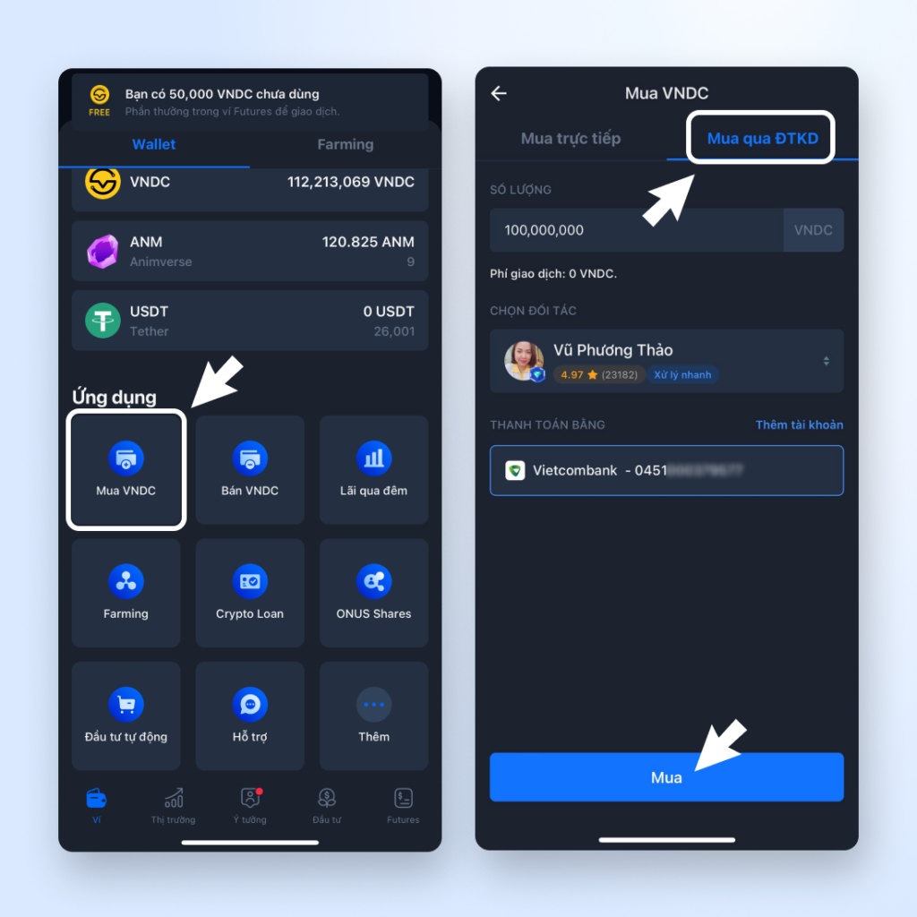 - Chọn phương thức: “Mua VNDC”