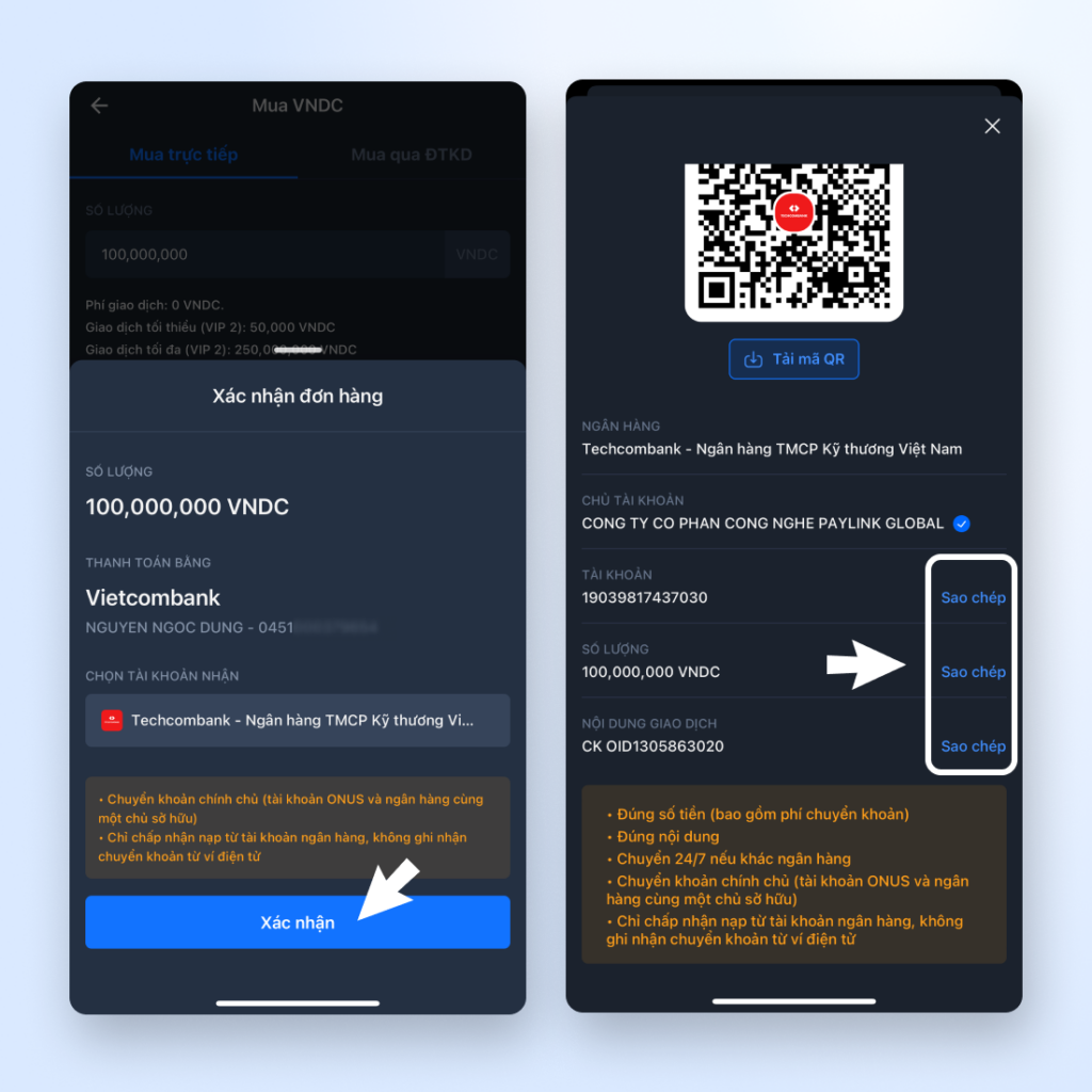 - Với các đơn mua VNDC không chính chủ, ONUS sẽ không hỗ trợ khớp đơn. Nếu bạn vô tình tạo đơn Mua VNDC không chính chủ, vui lòng liên hệ phía ngân hàng/ ví điện tử để yêu cầu hoàn trả.